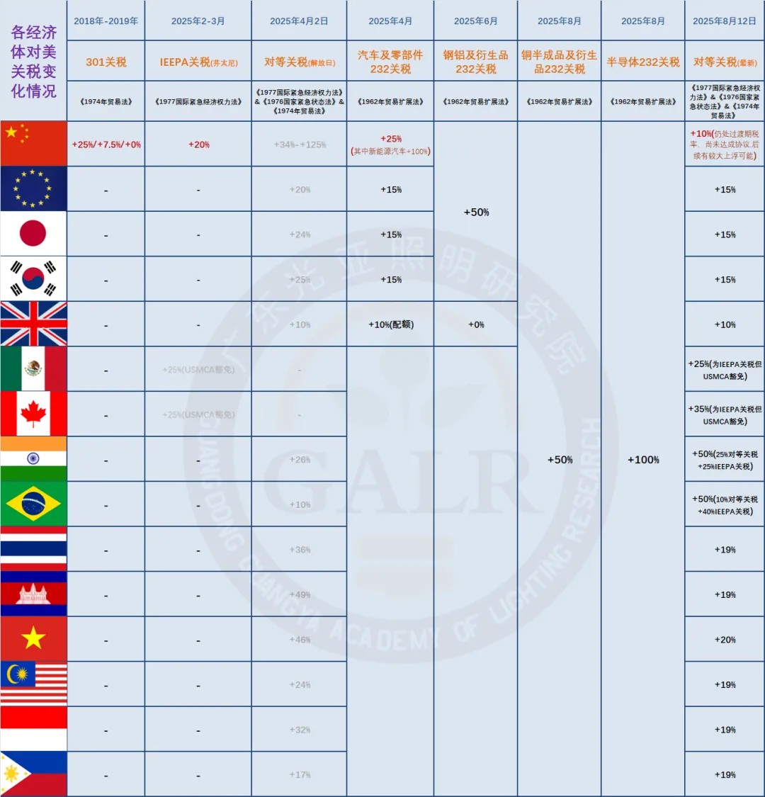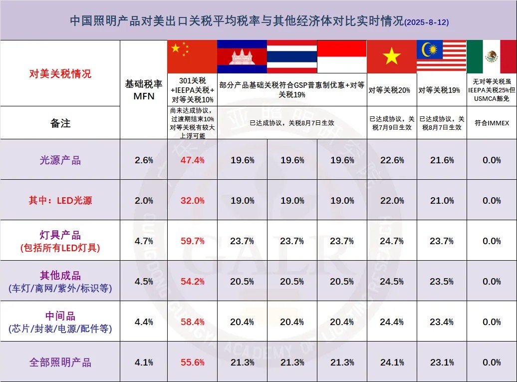 即便按照目前过渡期10%的对等关税计算,叠加之前未被取消的301关税和两轮IEEPA特定关税,中国照明产品对美现行税率对比其他经济体仍旧畸高。