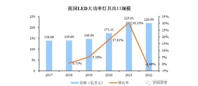 随着LED技术进步及碳中和等理念成为国际共识,LED灯具应用场景逐渐延伸至户外、工业照明等领域,迎来市场发展机遇。根据中国照明电器协会数据显示,2022年度,我国LED大功率灯具(涵盖路灯、工矿灯、泛光灯、植物灯等灯具,覆盖了户外、工业照明等应用领域)出口金额达220.00亿美元,2020年至2022年我国LED大功率灯具复合增长率为12.73%。