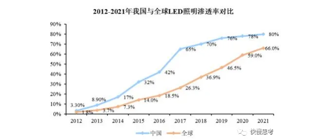 近十年来,我国进一步加大对节能照明工程的推广,以LED照明为代表的节能照明产品在技术进步下得到广泛使用,国内渗透率明显上升,2012年仅为3.3%,截至2021年,渗透率已上升至80%。