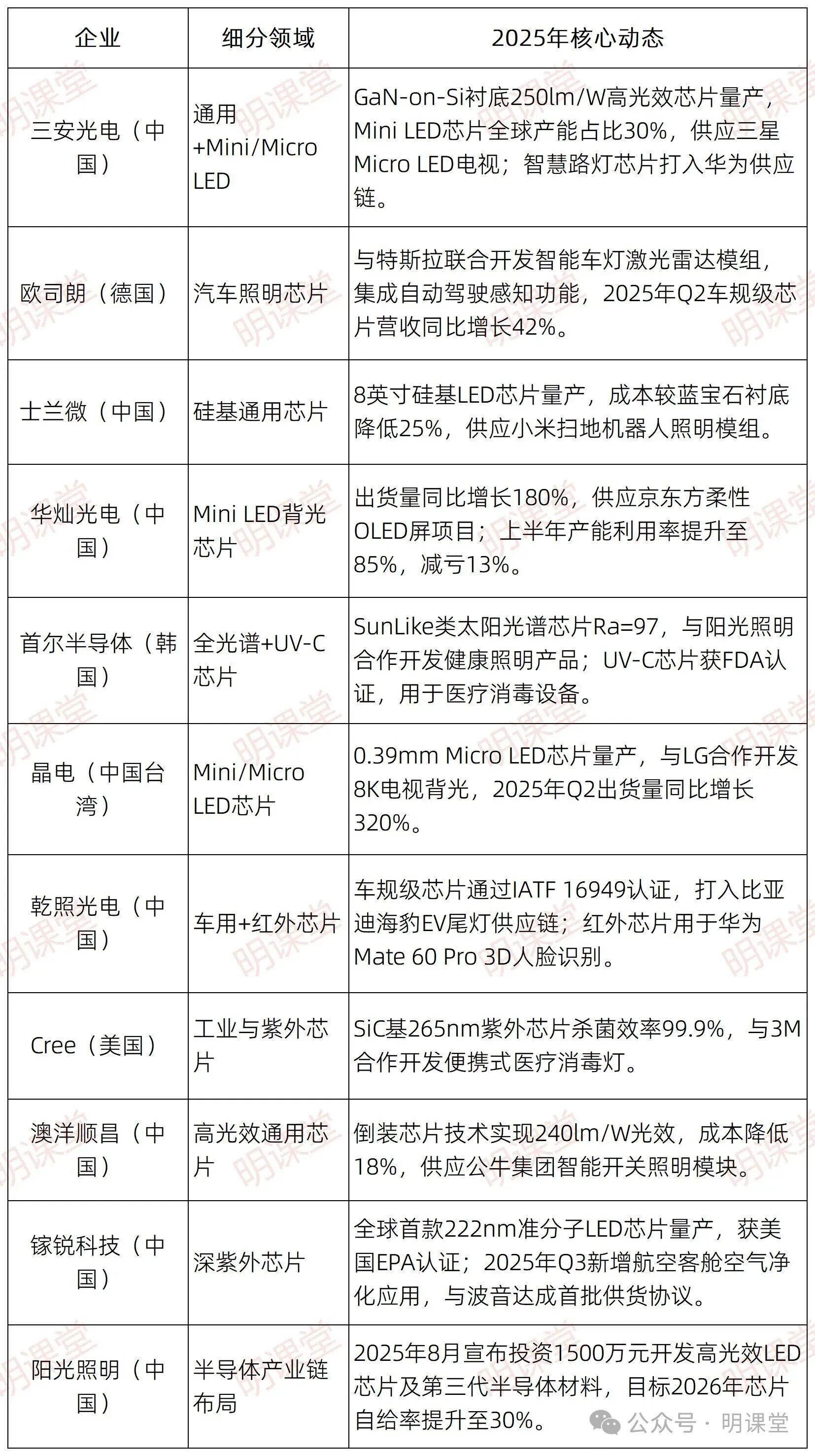 产业链各环节呈现“头部集中+技术跨界”特征:上游芯片企业突破GaN-on-Si衬底与深紫外技术,中游封装企业向“芯片+模组”垂直整合,下游应用企业则通过AI算法、全光谱技术与跨场景解决方案(如航空照明、深海探测)建立壁垒。