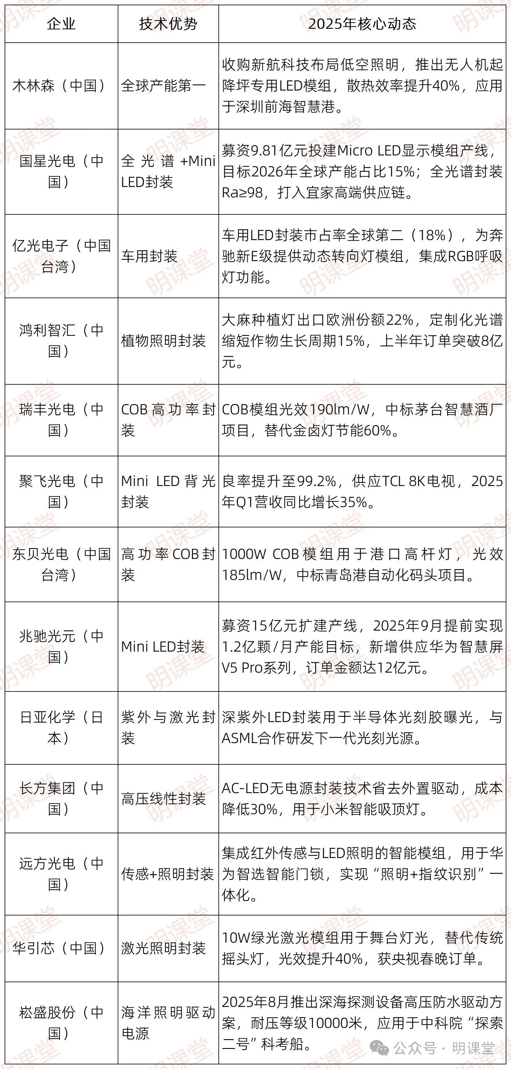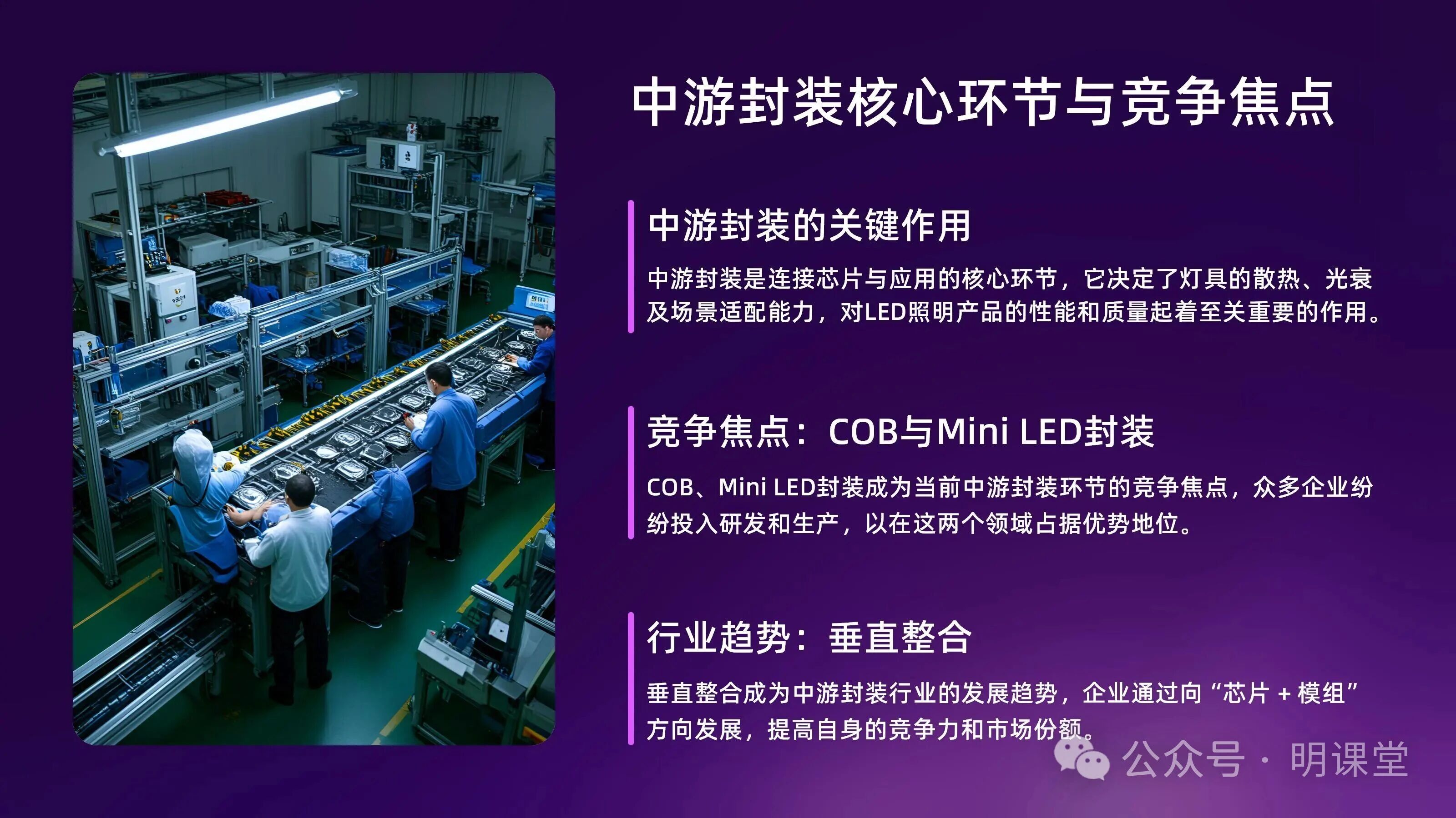 核心环节:连接芯片与应用,决定灯具散热、光衰及场景适配能力,COB、Mini LED封装为竞争焦点。