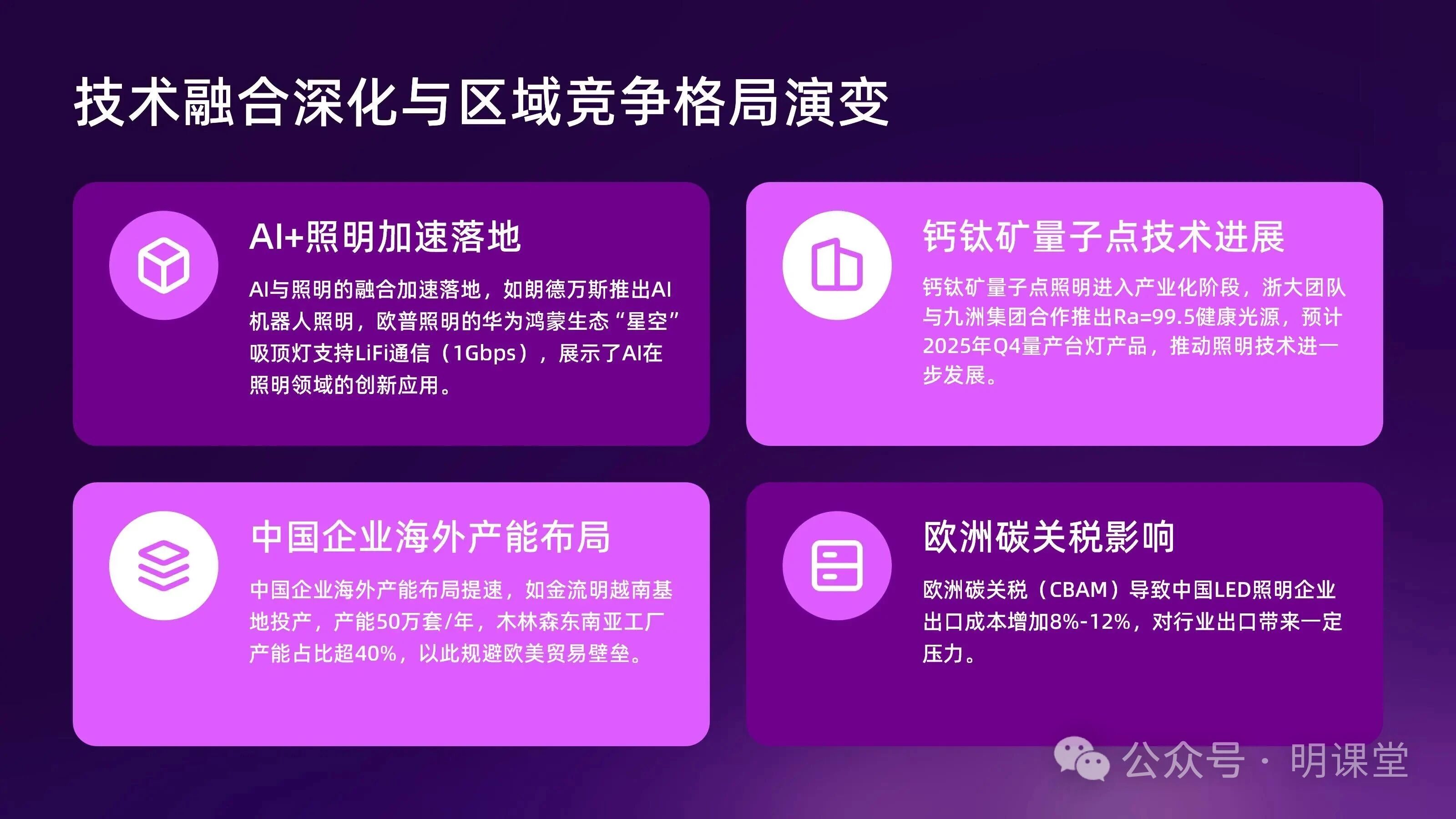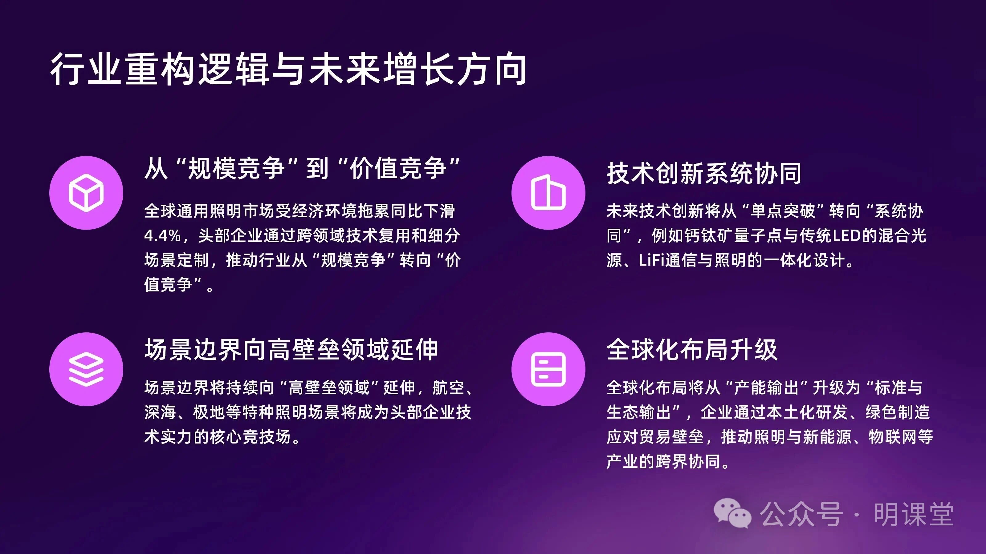 三是全球化布局从“产能输出”升级为“标准与生态输出”,通过本土化研发、绿色制造应对贸易壁垒,同时推动照明与新能源、物联网等产业的跨界协同。