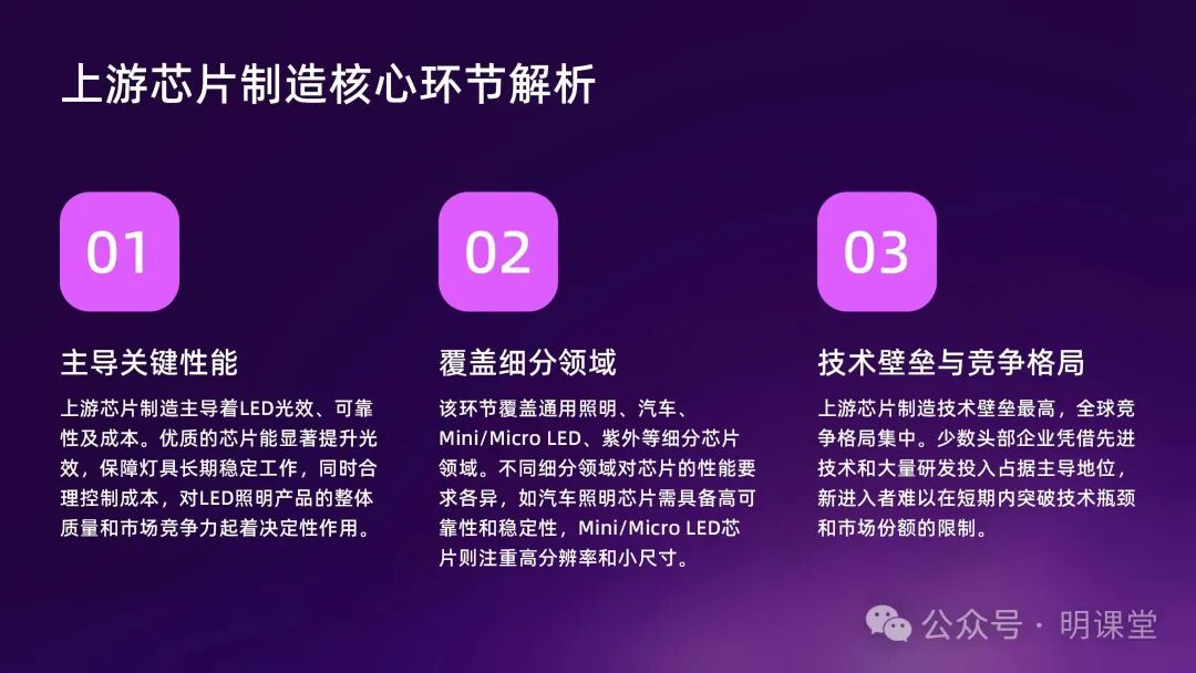 核心环节:主导LED光效、可靠性及成本,覆盖通用照明、汽车、Mini/Micro LED、紫外等细分芯片领域。