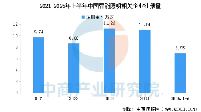 中国智能照明相关企业注册量快速增长,显示出强劲的行业吸引力和良好的发展前景。中商产业研究院发布的《2025-2030年全球及中国智能照明市场调查与行业前景预测专题研究报告》显示,2024年中国智能照明相关企业注册量达11.04万家。2025年上半年,中国智能照明相关企业注册量已达到6.95万家。