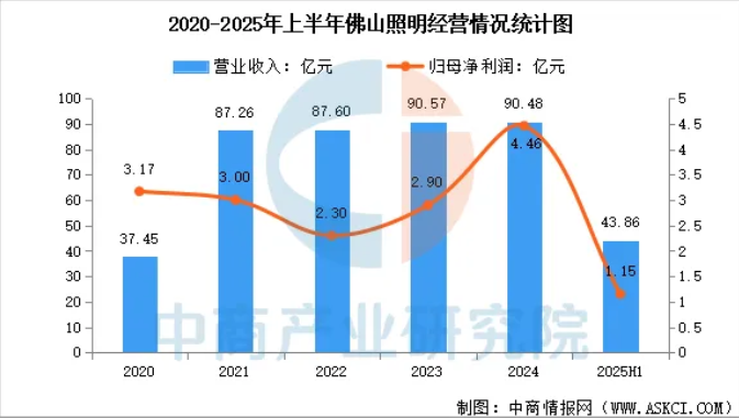 2025年上半年,佛山照明营业收入为43.86亿元,同比下降8.34%,归母净利润为1.15亿元,同比下降40.18%。上半年,公司通用照明产品收入15.56亿元,占比35.47%,LED封装及组件产品收入11.39亿元,占比25.97%,车灯产品收入10.14亿元,占比23.11%。