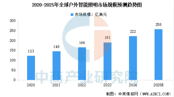 随着物联网、人工智能、大数据等技术的不断发展,通过LED照明器件与控制系统结合,LED照明产品的智能化、自动化特质凸显,能够实现对LED光源的亮度、色温、定时开关等参数的控制及与其他智能设备或系统进行联动,智能化成为未来户外照明的重要延伸方向之一。中商产业研究院发布的《2025-2030年全球及中国智能照明市场调查与行业前景预测专题研究报告》显示,2024年全球户外智能照明市场规模达到222亿美元。中商产业研究院分析师预测,2025年全球户外智能照明市场规模将达到258亿美元。