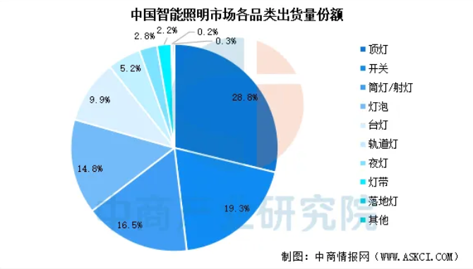 中商产业研究院发布的《2025-2030年全球及中国智能照明市场调查与行业前景预测专题研究报告》显示,中国智能照明市场中,顶灯占比最大(28.8%),其次是开关(19.3%)、筒灯/射灯(16.5%)、灯泡(14.8%)、台灯(9.9%)等,夜灯、灯带和落地灯等品类占比相对较小。整体趋势表明,消费者对智能照明产品的接受度逐渐提高,无主灯概念的推广进一步推动了市场发展。