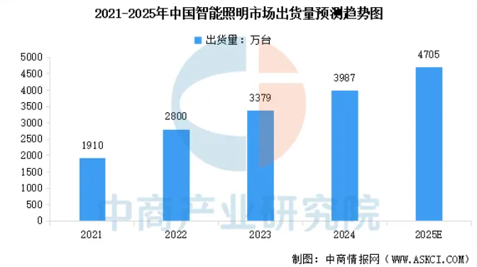 中国智能照明市场正处于快速增长阶段,出货量稳步提升,展现出强劲的市场活力。中商产业研究院发布的《2025-2030年全球及中国智能照明市场调查与行业前景预测专题研究报告》显示,2023年中国智能照明市场出货量约3379万台,同比增长20.7%,2024年出货量约3987万台。中商产业研究院分析师预测,2025年中国智能照明市场出货量将达到4705万台。