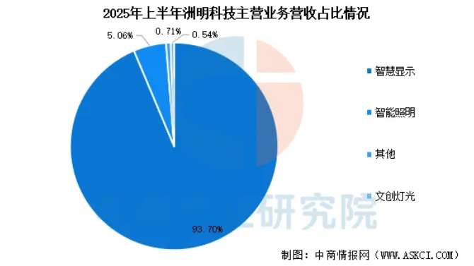 2025年上半年,洲明科技营业收入为36.58亿元,同比增长7.38%,归属于上市公司股东的净利润为1.21亿元,同比增长20.61%。上半年,公司智能照明收入1.85亿元,占比5.06%。