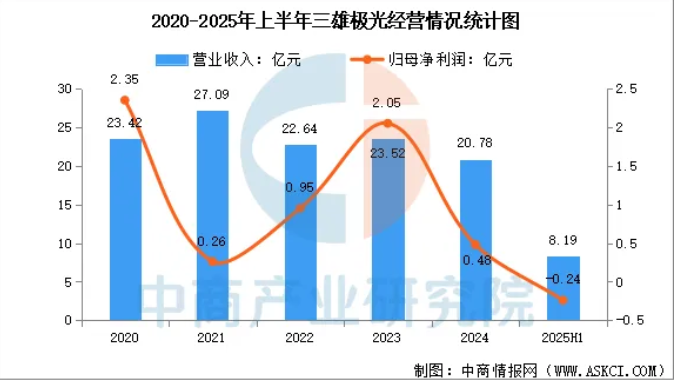 2025年上半年,三雄极光营业收入为8.19亿元,同比下降16.49%,归母净利润亏损2366.42万元,同比下降156.41%。上半年,公司照明灯具收入7.121亿元,占比86.91%,照明控制类及其他收入8912万元,占比10.88%。
