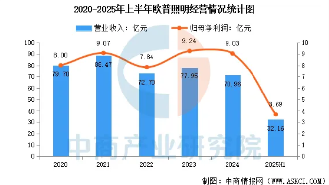 2025年上半年,欧普照明实现营业收入32.16亿元,同比下降4.46%,归属于上市公司股东的净利润为3.69亿元,同比下降4.07%。上半年,公司照明行业收入31.83亿元,占比98.97%。