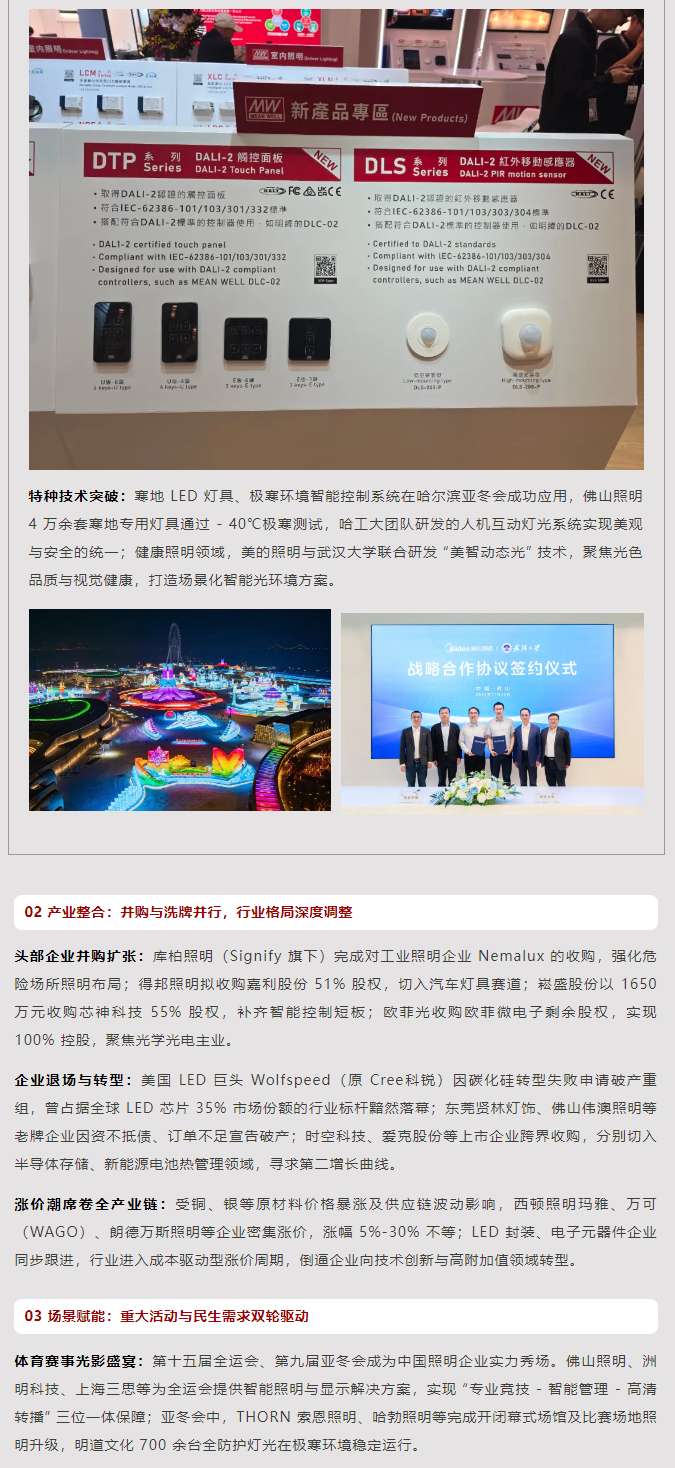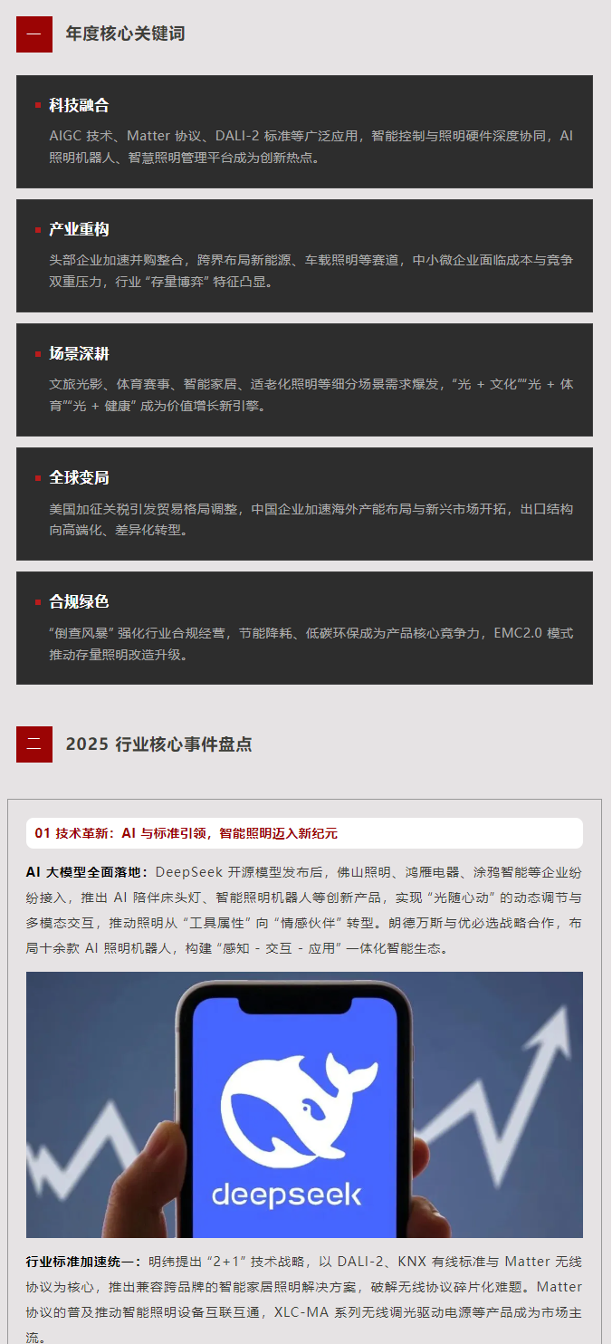 2025 年,照明行业在技术革新、产业整合与场景拓展的多重驱动下,呈现出 “科技深度融合、产业加速洗牌、场景全面赋能” 的鲜明特征。从 AI 大模型落地到跨国并购频发,从重大赛事光影保障到全球贸易格局调整,行业在变革中突破边界,在调整中锚定方向,“智能、融合、合规、绿色” 成为贯穿全年的核心关键词,推动照明产业从传统制造向高附加值服务与解决方案领域全面升级。