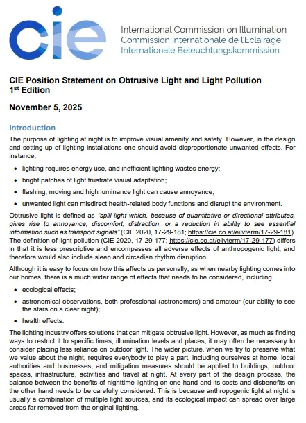 本立场声明可免费下载,请访问CIE立场声明网页获取,链接:https://cie.co.at/publications/cie-ps-0032025-cie-position-statement-obtrusive-light-and-light-pollution-1st-edition。