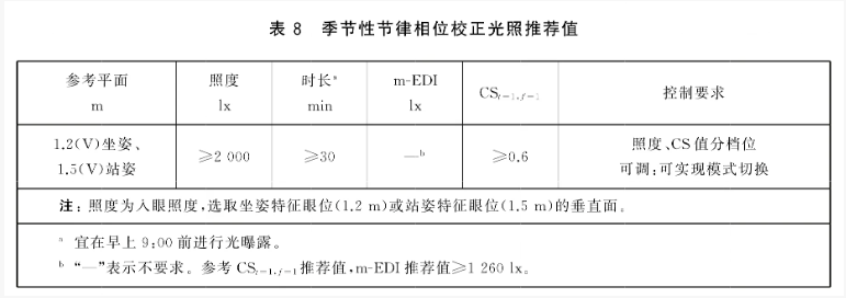 此外,标准还制定了季节性节律相位校正光照的推荐值,要求入眼照度≥2000lx,光照时长不少于 30 分钟,且宜在早上 9:00 前进行光曝露。