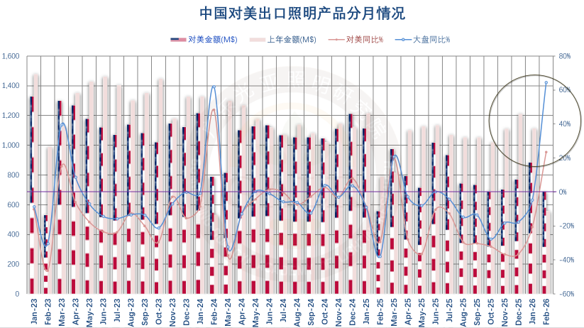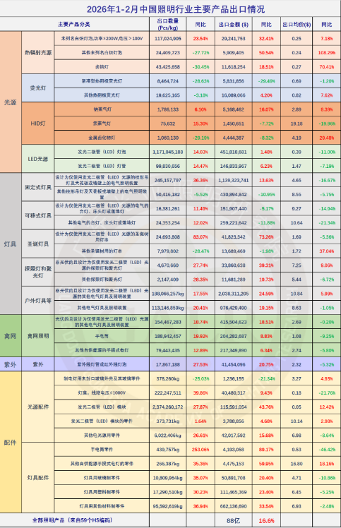 2026年1-2月,中国照明产品出口额录得88亿美元,同比增长16.6%,自去年6月以来首次增长;其中1月出口额为50亿美元,同比小幅下降4.7%;2月出口额为38亿美元,同比大幅增长64.5%。受上年同期1月基数偏低和2月春节错位以及2月20日美国最高法院推翻特朗普依据IEEPA征收的关税后,出口企业及时抓住窗口期抢跑,上游材料大幅涨价倒逼终端价格等因素所带动。